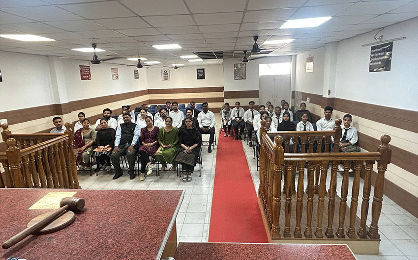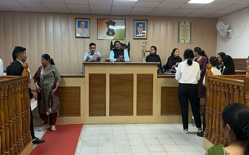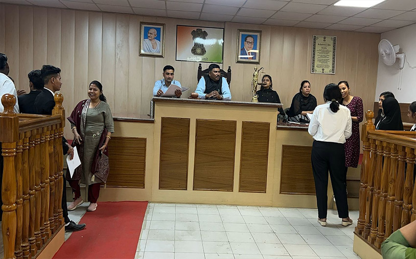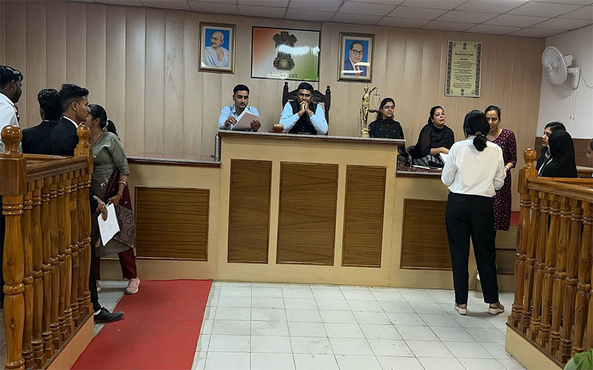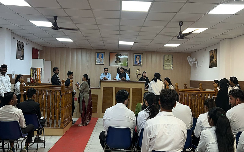The Moot court Hall is like a practical room for a student to get accustomed to the atmosphere of the Courts as well as improve his skills in law and advocacy of law. In a Moot court a hypothetical case is given to the students and is allowed to argue the given case. The participants research their respective sides, write appellate briefs, and present oral arguments in front of the judges. Judges are free to ask questions at any time during the presentation, and students must respond accordingly; therefore, a profound understanding of the facts of the case, their arguments, and their opponents” arguments is required.